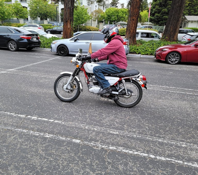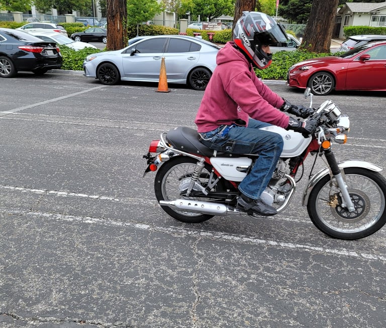 Make your DMV appointment. Then make your appointment with me for a selected time. The fee is $150. for Santa Clara and Los Gatos for the skills riding test. You will need to show up 1 hour before your DMV appointment. you will get to practice riding for 1 hour before your test to get the feel of the bike and learn where the controls are. You may also rent the bike for one hour of practice on DMVs skills riding course after DMV closes, the fee for the one hour of practice is $100., 1/2-hour practice is $50. DMV closes at 5 pm. The latest time you can rent after hours is 6 PM. Santa Clara and Los Gatos DMV only does the M1 riding test on Wednesday mornings